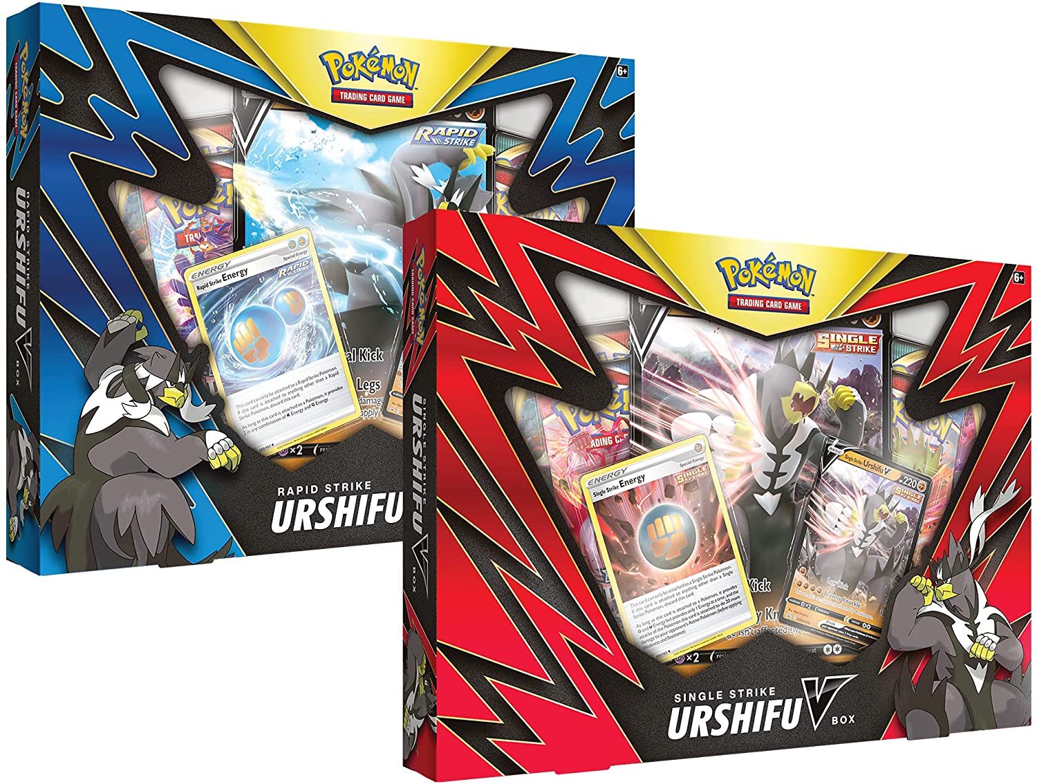 Tenacious little Kubfu has grown wise and dangerous, training in one of the Towers of Two Fists. That effort has undeniably paid off as the Pokémon now commands extraordinary power as Single Strike Urshifu V or Rapid Strike Urshifu V! Depending on its preferred training method, this Pokémon V either channels all its power into one mighty knockout blow or unleashes a rapid flurry of strikes to defeat its opponent. Enhance your collection with this martial arts Pokémon, and find helpful allies, skilled Trainers, beautiful art, and other treasures in this Pokémon TCG box.